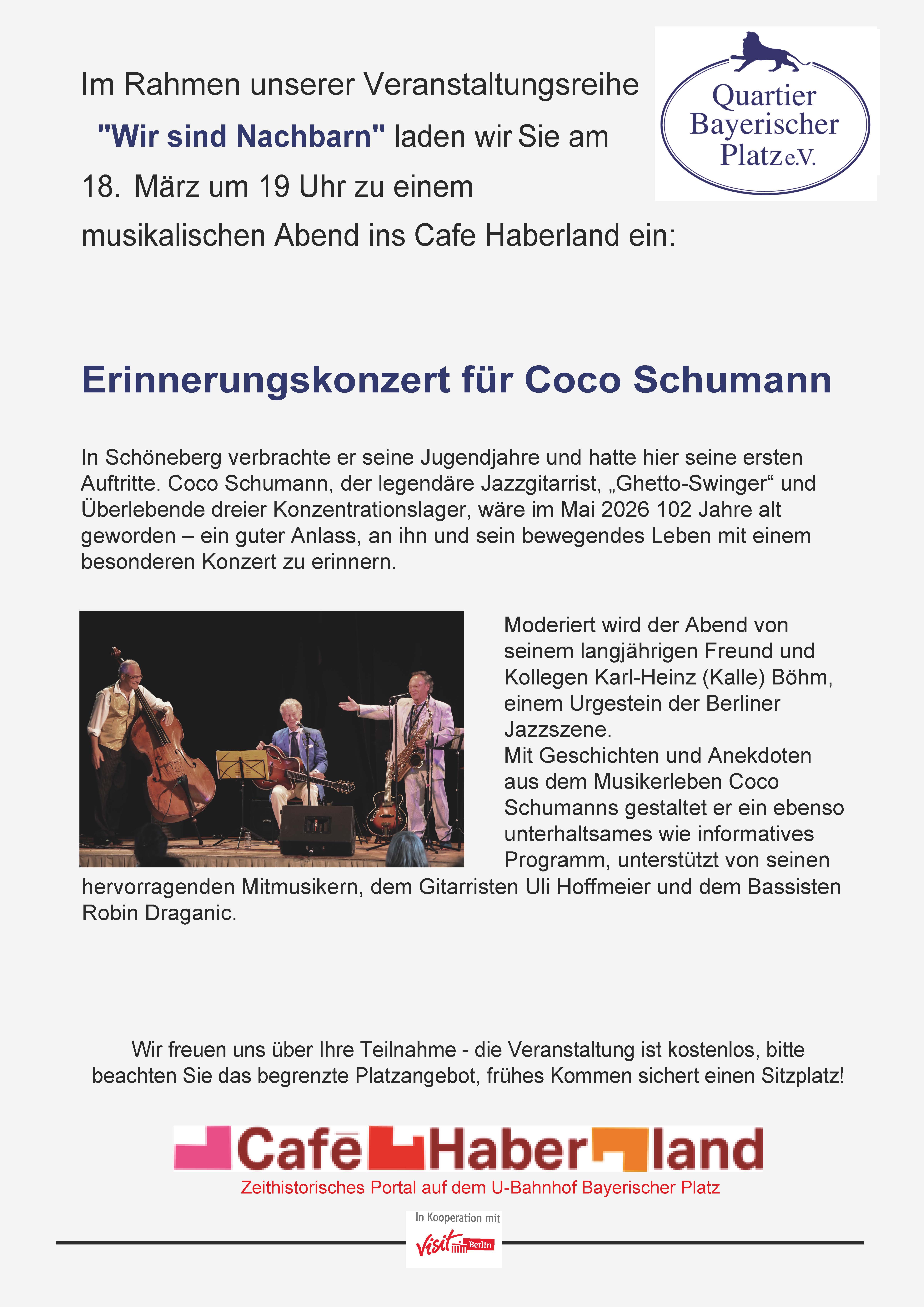Grund genug, an ihn und sein Schicksal mit Konzerten zu erinnern, die sein langjähriger Freund und Kollege, der Saxofonist Karl-Heinz Böhm, organisiert, leitet und moderiert. Neben Originalarrangements von Cocos Lieblings-Swing-Titeln werden auch einige seiner Eigenkompositionen erklingen.