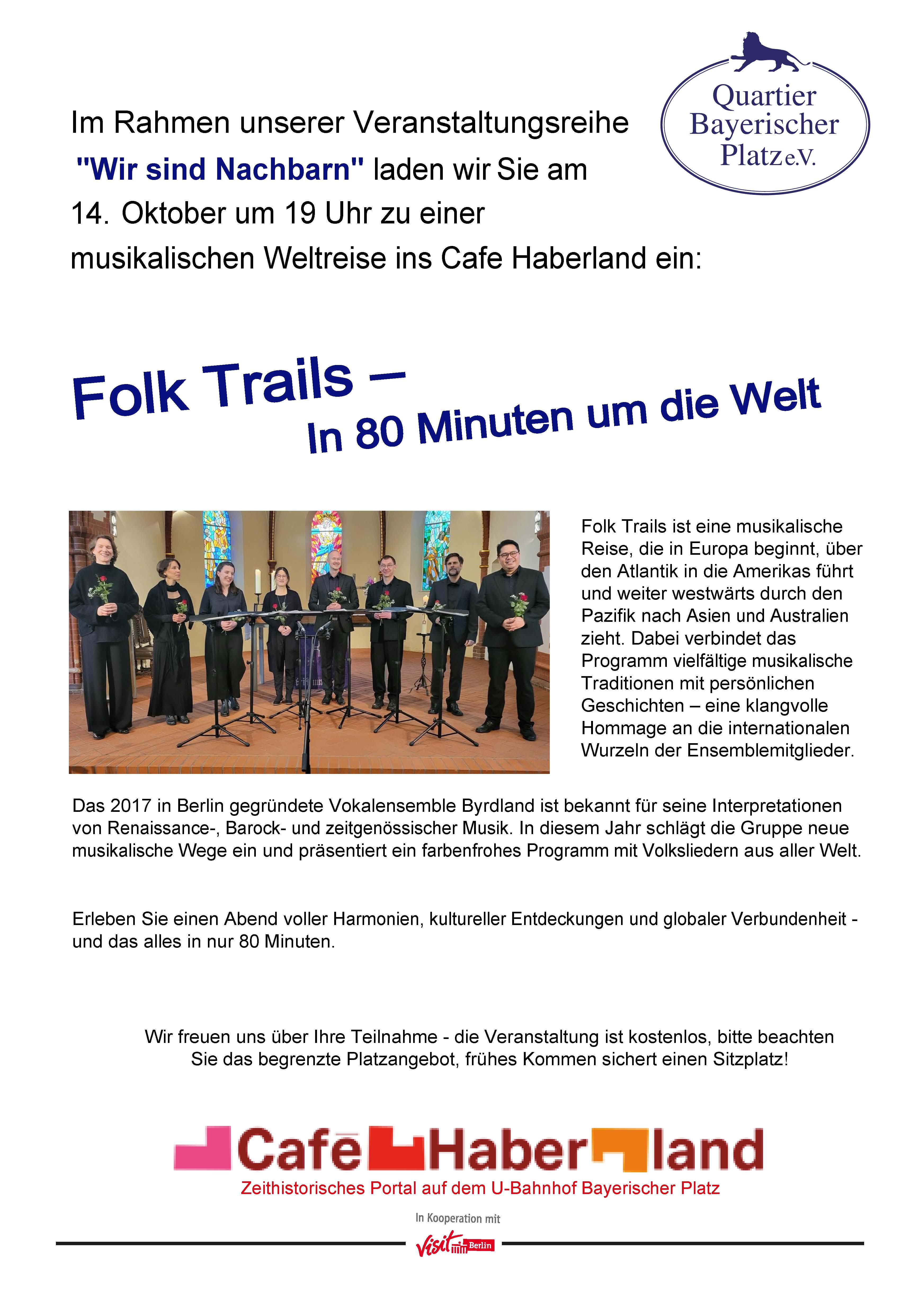 Folk Trails ist eine musikalische Reise, die in Europa beginnt, über den Atlantik in die Weite Amerikas und weiter westwärts durch den Pazifik nach Asien und Australien führt. Dabei verbindet das Programm vielfältige musikalische Traditionen mit persönlichen Geschichten - eine klangvole Hommage an die internationalen Wurzeln der Ensemblemitglieder.
